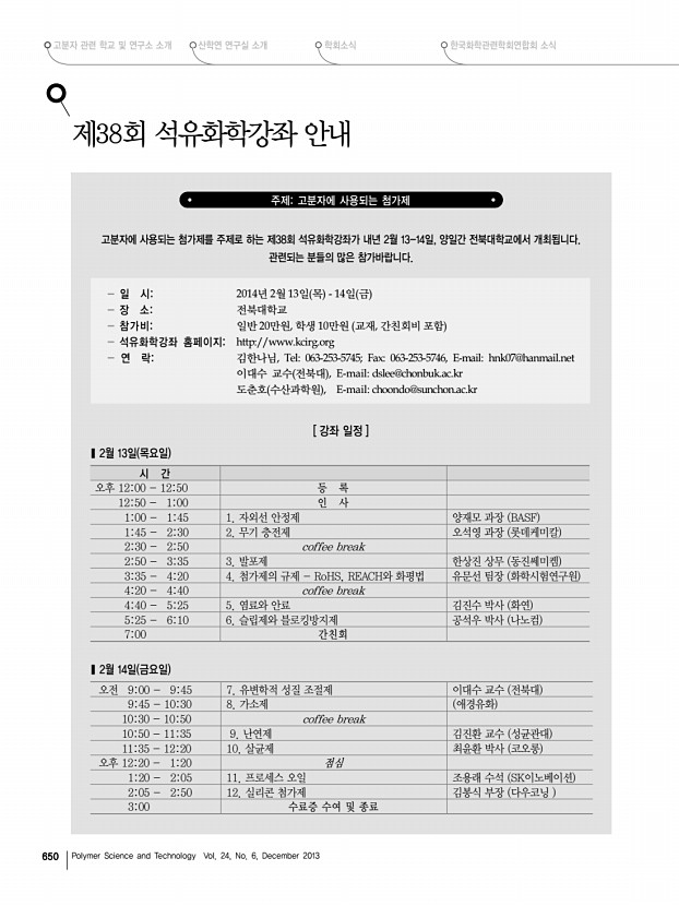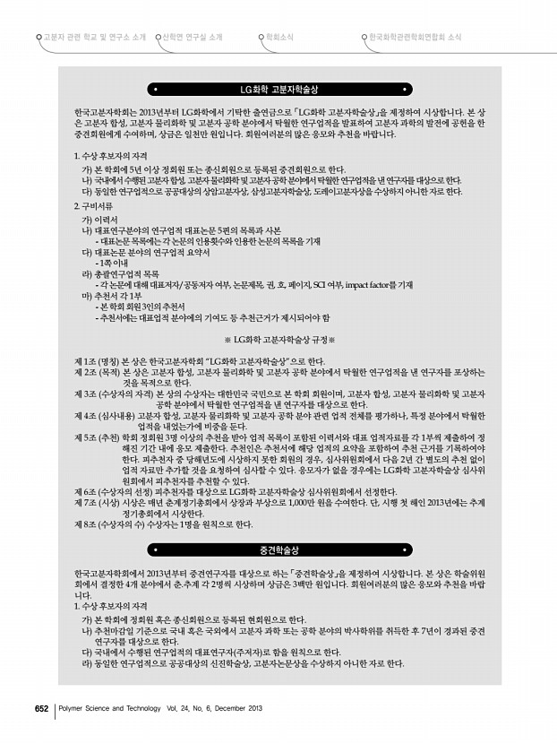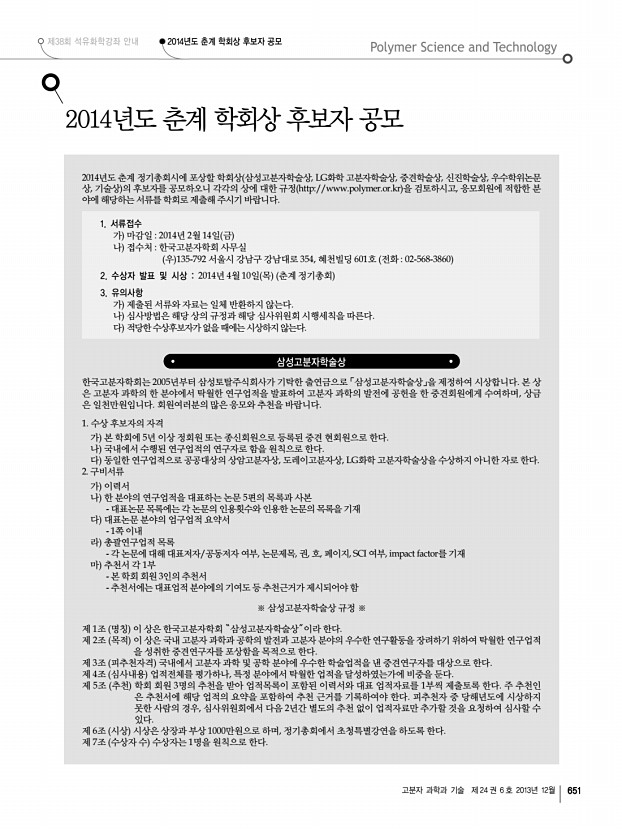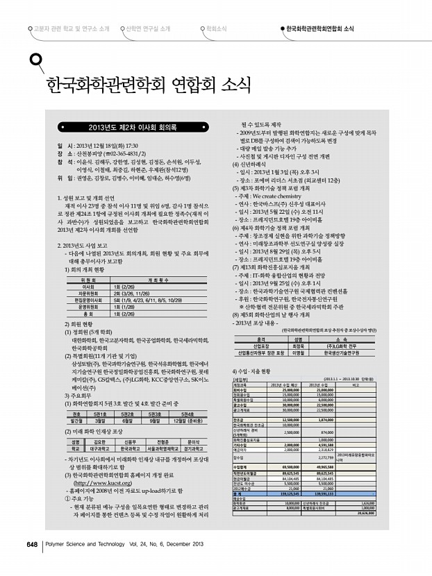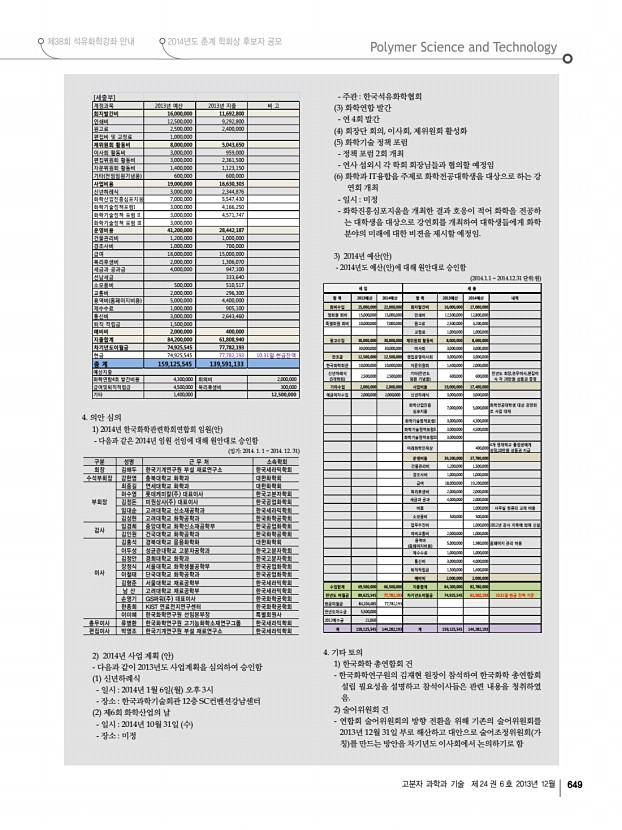 제38회 석유화학강좌 안내 2014년도 춘계 학회상 후보자 공모 고분자 과학과 기술 제 24 권 6 호 2013년 12월 649 [세출부] 계정과목 2013년 예산 2013년 지출 비 고 회지발간비 16,000,000 11,692,800 인쇄비 12,500,000 9,292,800 원고료 2,500,000 2,400,000 편집비 및 교정료 1,000,000 제위원회 활동비 8,000,000 5,043,650 이사회 활동비 3,000,000 959,000 편집위원회 활동비 3,000,000 2,361,500 자문위원회 활동비 1,400,000 1,123,150 기타 전임임원기념품 600,000 600,000 사업비용 19,000,000 16,630,303 신년하례식 3,000,000 2,344,876 화학산업진흥심포지움 7,000,000 5,547,430 화학기술정책포럼I 3,000,000 4,166,250 화학기술정책 포럼 II 3,000,000 4,571,747 화학기술정책 포럼 III 3,000,000 운영비용 41,200,000 28,442,187 건물관리비 1,200,000 1,000,000 경조사비 1,000,000 700,000 급여 18,000,000 15,000,000 복리후생비 2,000,000 1,306,070 세금과 공과금 ...