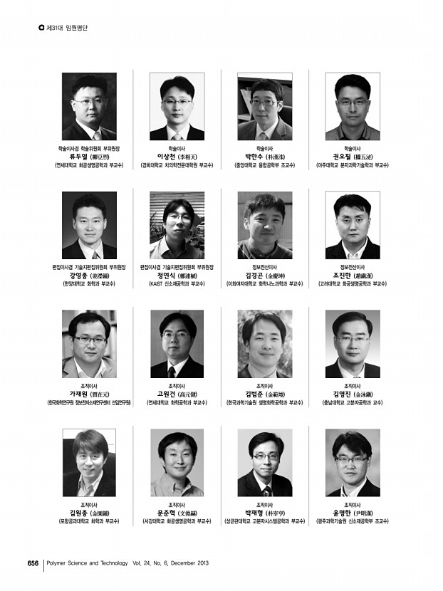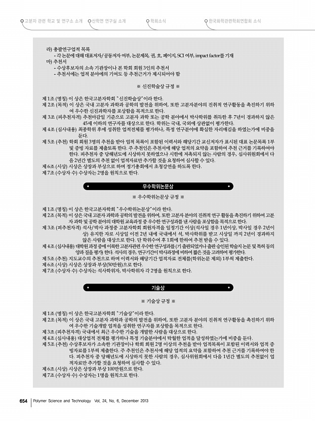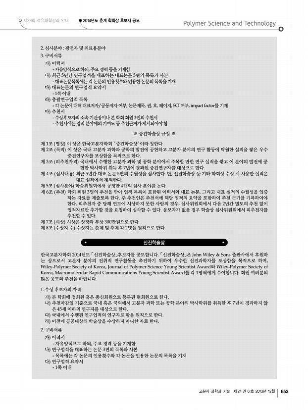 ... 2013 라 총괄연구업적 목록 각 논문에 대해 대표저자/공동저자 여부, 논문제목, 권, 호, 페이지, SCI 여부, impact factor를 기재 마 추천서 수상후보자의 소속 기관장이나 본 학회 회원 3인의 추천서 추천서에는 업적 분야에의 기여도 등 추천근거가 제시되어야 함 ※ 신진학술상 규정 ※ 제 1조 명칭 이 상은 한국고분자학회 “신진학술상”이라 한다. 제 2조 목적 이 상은 국내 고분자 과학과 공학의 발전을 위하여, 또한 고분자분야의 진취적 연구활동을 촉진하기 위하 여 우수한 신진과학자를 포상함을 목적으로 한다. 제 3조 피추천자격 추천마감일 기준으로 고분자 과학 또는 공학 분야에서 박사학위를 취득한 후 7년이 경과하지 않은 45세 이하의 연구자를 대상으로 한다. 학위는 국내, 국외에 상관없이 평가한다. 제 4조 심사내용 최종학위 후에 성취한 업적...