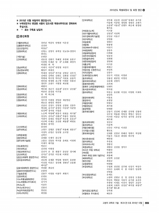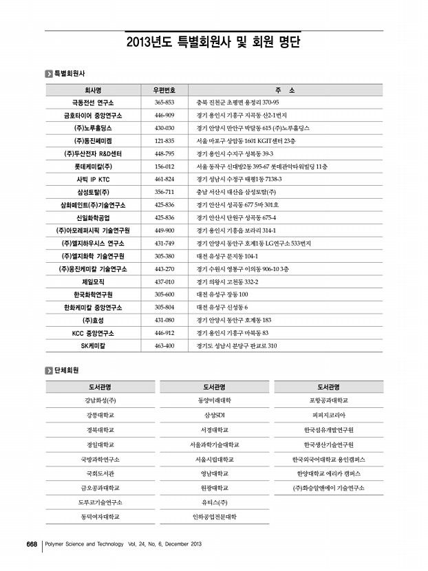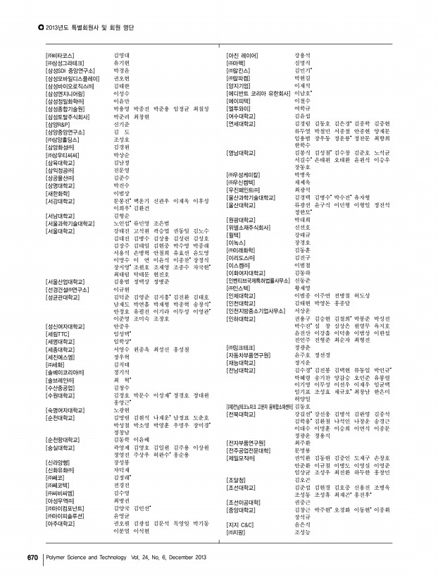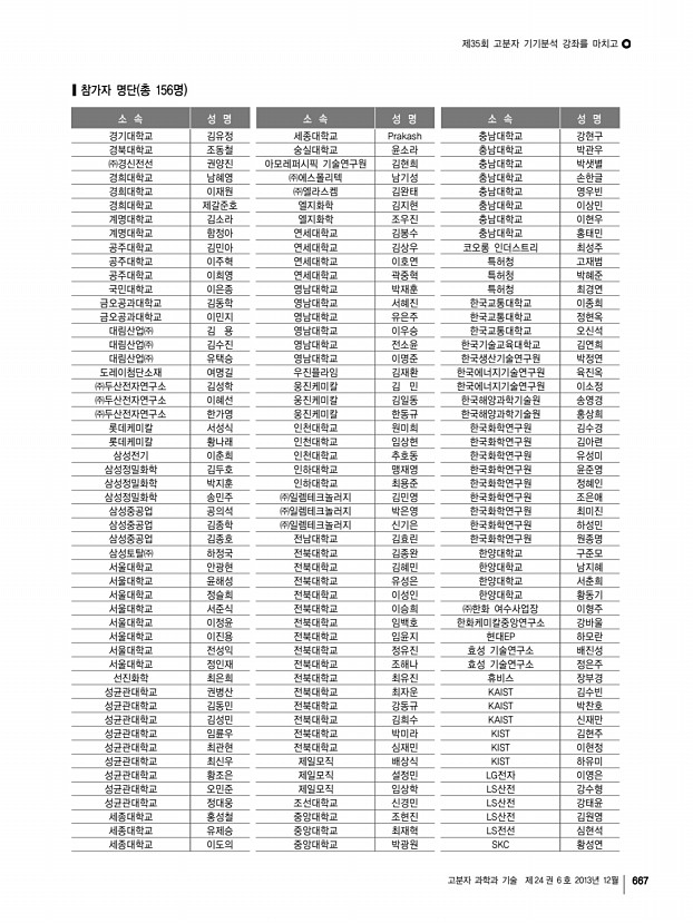 제35회 고분자 기기분석 강좌를 마치고 고분자 과학과 기술 제 24 권 6 호 2013년 12월 667 소 속 성 명 소 속 성 명 소 속 성 명 경기대학교 김유정 세종대학교 Prakash 충남대학교 강현구 경북대학교 조동철 숭실대학교 윤소라 충남대학교 박관우 ㈜경신전선 권양진 아모레퍼시픽 기술연구원 김현희 충남대학교 박샛별 경희대학교 남혜영 ㈜에스폴리텍 남기성 충남대학교 손한글 경희대학교 이재원 ㈜엘라스켐 김완태 충남대학교 영우빈 경희대학교 제갈준호 엘지화학 김지현 충남대학교 이상민 계명대학교 김소라 엘지화학 조우진 충남대학교 이현우 계명대학교 함정아 연세대학교 김봉수 충남대학교 홍태민 공주대학교 김민아 연세대학교 김상우 코오롱 인더스트리 최성주 공주대학교 이주혁 연세대학교 이호연 특허청 고재범 공주대학교 이희영 연세대...