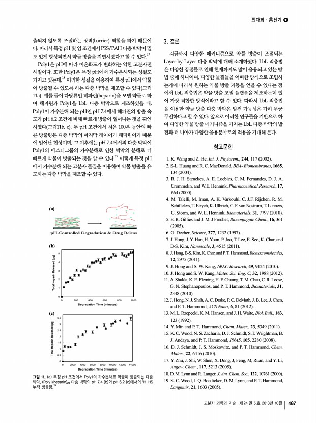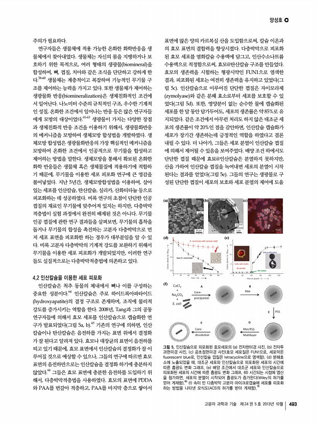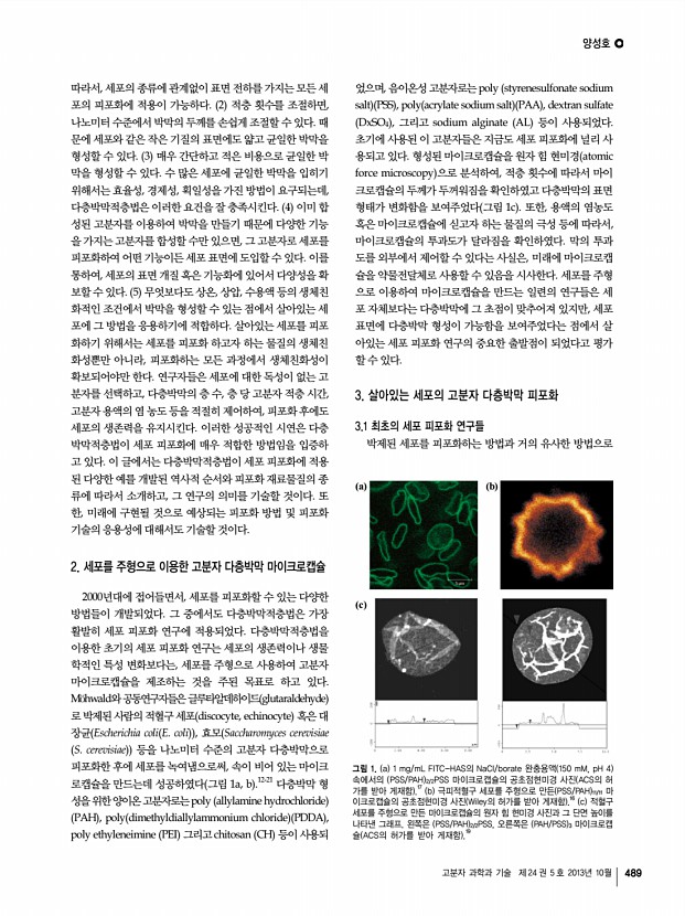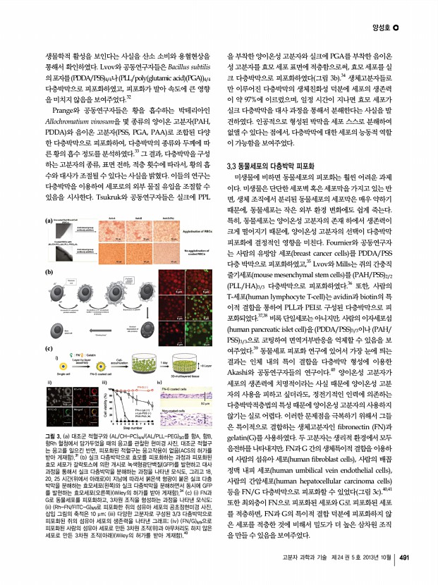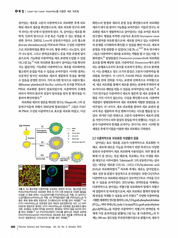 ...포의 출아 과정. 모세포는 녹색의 박막을 보이지만, 딸세포는 박막이 없음 ACS의 허가 를 받아 게재함 .24 d PEI/PSS/RBITC-PAH 를 줄무늬로 코팅한 표면에 PAH/PSS/Alexa 555 -PAH/PSS 로 피포화된 효모 세포를 선택적으로 흡 착시킨 형광현미경 사진 ACS의 허가를 받아 게재함 .25 살아있는 세포를 고분자 다층박막으로 피포화한 후에 피포 화된 세포의 생존을 확인함으로써, 세포 피포화 연구의 과학 적 의미는 한 단계 더 발전하게 된다. 즉, 살아있는 세포를 화 학적, 인위적 방식으로 수정 혹은 가공할 수 있는 방법을 마 련한 것이다. 2002년, Lvov와 공동연구자들은 소의 혈소판 bovine thrombocyte 을 PDDA와 PSS로 구성된 다층박막 으로 피포화하였을 뿐만 아니라, 형광 라텍스 나노입자, 실리 카 나노입자, 그리고 면역글로불린 G 등을 적층 과정에 넣어 줌으로써, 기능화된 다층...