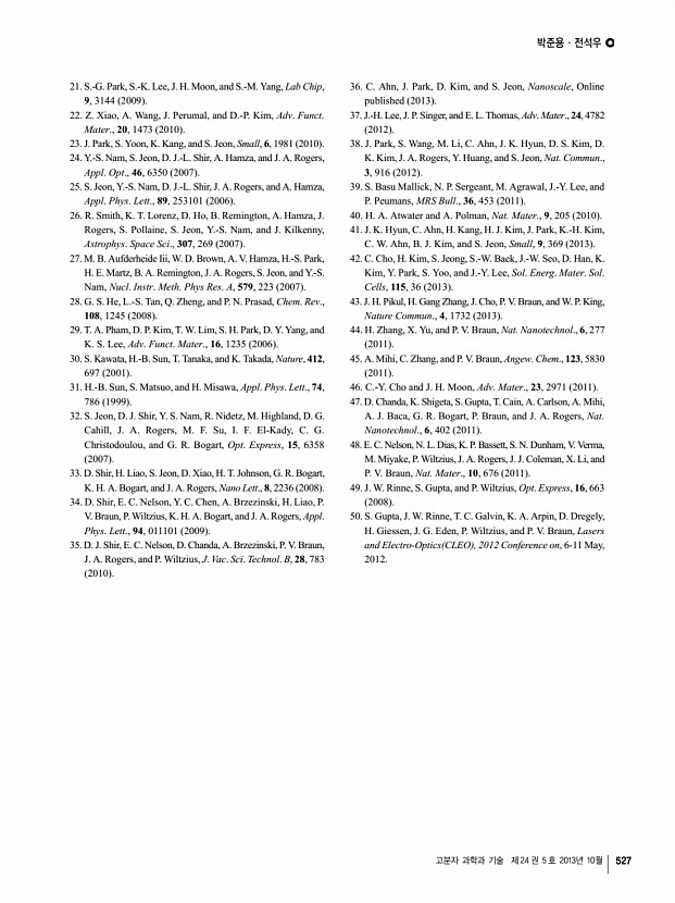 박준용ㆍ전석우 고분자 과학과 기술 제 24 권 5 호 2013년 10월 527 21. S.-G. Park, S.-K. Lee, J. H. Moon, and S.-M. Yang, Lab Chip, 9, 3144 2009 22. Z. Xiao, A. Wang, J. Perumal, and D.-P. Kim, Adv. Funct. Mater., 20, 1473 2010 23. J. Park, S. Yoon, K. Kang, and S. Jeon, Small, 6, 1981 2010 24. Y.-S. Nam, S. Jeon, D. J.-L. Shir, A. Hamza, and J. A. Rogers, Appl. Opt., 46, 6350 2007 25. S. Jeon, Y.-S. Nam, D. J.-L. Shir, J. A. Rogers, and A. Hamza, Appl. Phys. Lett., 89, 253101 2006 26. R. Smith, K. T. Lorenz, D. Ho, B. Remington, A. Hamza, J. Rogers, S. Pollaine, S. Jeon, Y.-S. Nam, and J. Kilkenny, Astrophys. Space Sci., 307, 269 2007 27. M. B. Aufderheide Iii, W. D. Brown, A. V. Hamza, H.-S. Park, H. E. Martz, B. A. Remington, J. A. Rogers, S. Jeon, and Y.-S. Nam, Nucl. Instr. Meth. Phys Res. A, 579, 223 2007 28. G. S. He, L.-S. Tan, Q. Zheng, and P. N. Prasad, Chem. Rev., 108, 1245 2008 29. T. A. Pham, D. P. Kim, T. W. Lim, S. H. Park, D. Y. Yang, and K. S. Lee, Adv...