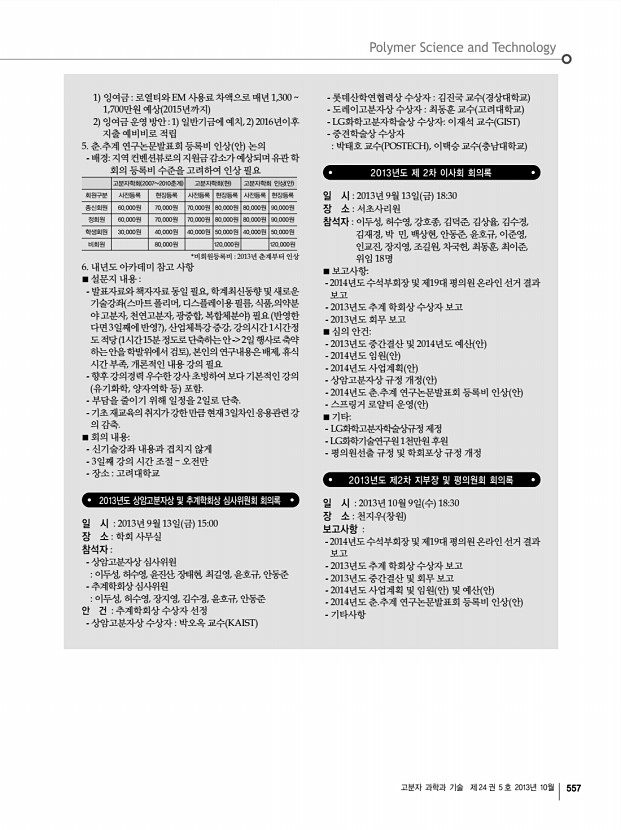고분자 과학과 기술 제 24 권 5 호 2013년 10월 557 1 잉여금 로열티와 EM 사용료 차액으로 매년 1,300 1,700만원 예상 2015년까지 2 잉여금 운영 방안 1 일반기금에 예치, 2 2016년이후 지출 예비비로 적립 5. 춘.추계 연구논문발표회 등록비 인상 안 논의 -배경지역 컨벤션뷰로의 지원금 감소가 예상되며 유관학 회의 등록비 수준을 고려하여 인상 필요 고분자학회 20072010춘계 고분자학회 현 고분자학회 인상 안 회원구분 사전등록 현장등록 사전등록 현장등록 사전등록 현장등록 종신회원 60,000원 70,000원 70,000원 80,000원 80,000원 90,000원 정회원 60,000원 70,000원 70,000원 80,000원 80,000원 90,000원 학생회원 30,000원 40,000원 40,000원 50,000원 40,000원 50,000원 비회원 80,000원 120,000원 120,000원 *비회원등록비 2013년 춘계부터 인상 6. 내년도 아카데미 참고 사항 ■ 설문지 내용 발...