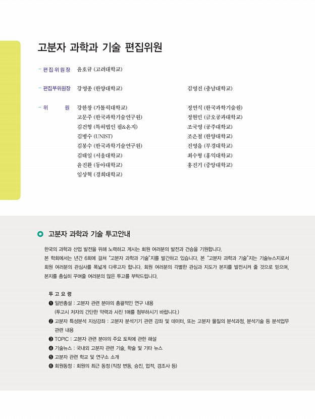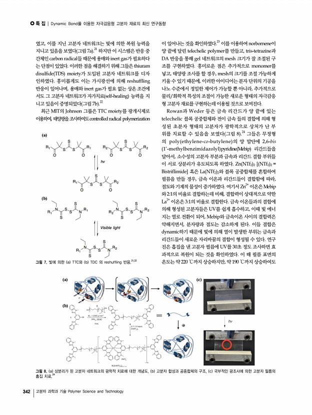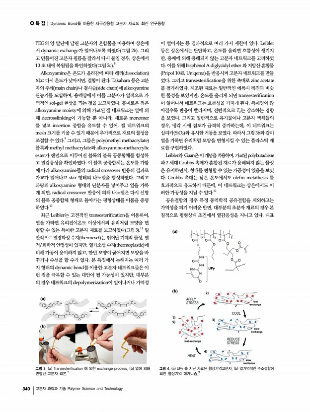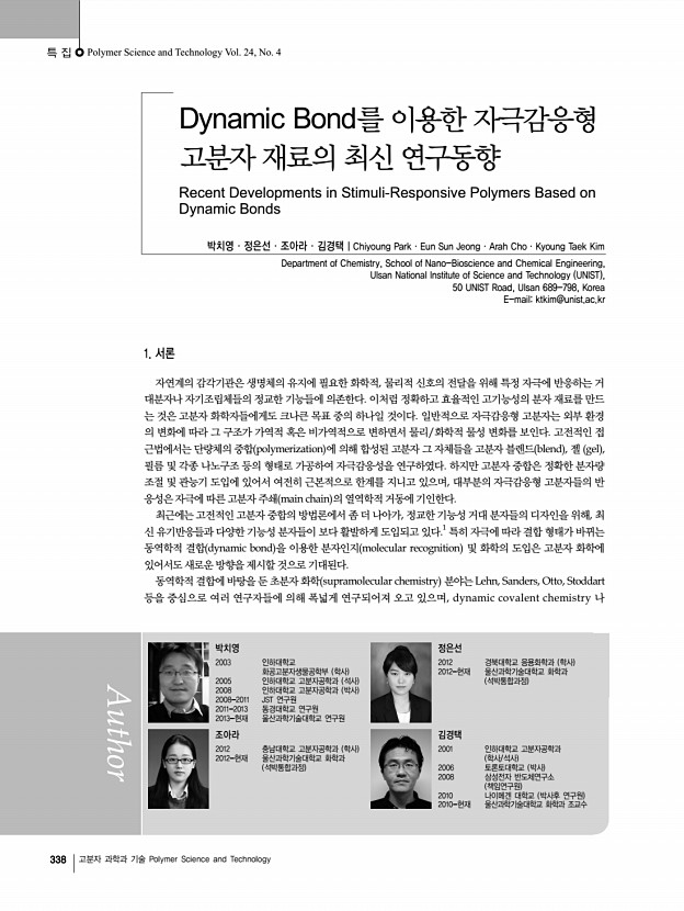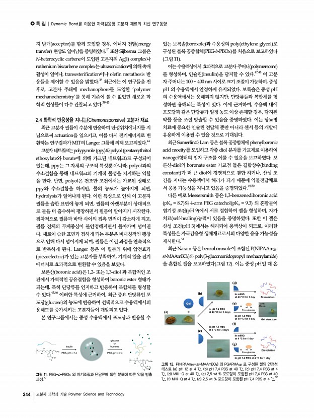 특 집 | Dynamic Bond를 이용한 자극감응형 고분자 재료의 최신 연구동향 344 고분자 과학과 기술 Polymer Science and Technology a b c d e f g 그림 12. P NIPAAm26-st-MAAmBO4 와 PGAPMA132 로 구성된 젤의 안정성 테스트 a pH 12 at 4 ℃, b pH 7.4 PBS at 40 ℃, c pH 7.4 PBS at 4 ℃, d Milli-Q at 40 ℃, e 2.5 wt % 포도당이 포함된 pH 7.4 PBS at 40 ℃, f Milli-Q at 4 ℃, g 2.5 wt % 포도당이 포함된 pH 7.4 PBS at 4 ℃.52 그림 11. PEG-b-PBOx 의 자기조립과 단당류에 의한 분해에 따른 약물 방출 과정.47 지 받개 acceptor 를 함께 도입할 경우, 에너지 전달 energy transfer 현상도 일어남을 증명하였다.37 또한 Sijbesma 그룹은 N-heterocyclic carbene이 도입된 고분자의 Ag I complex나 ruthenium biscarbene complex는ultrasonication에의해 촉매 활성이 일어나, transesterification이나 olefin metathesis 반 응들을 제어할 수 있음을 밝혔다.38 최근에는 이 연구들...