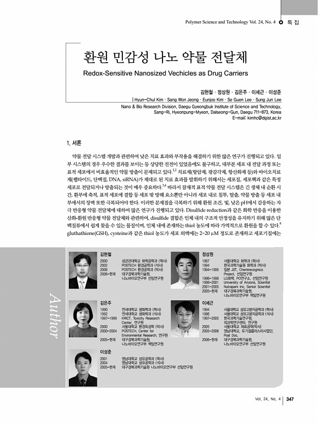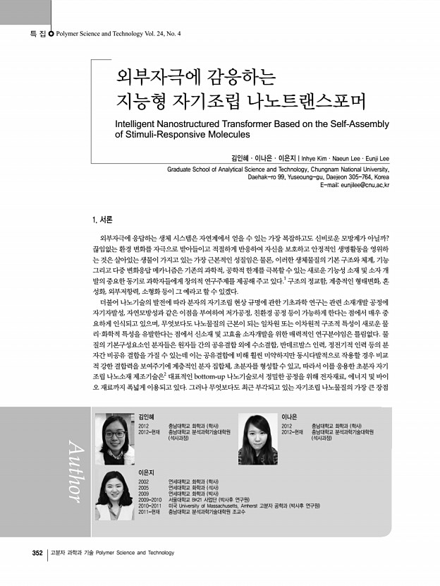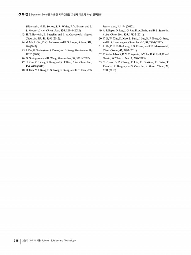 특 집 | Dynamic Bond를 이용한 자극감응형 고분자 재료의 최신 연구동향 346 고분자 과학과 기술 Polymer Science and Technology Silberstein, N. R. Sottos, S. R. White, P. V. Braun, and J. S. Moore, J. Am. Chem. Soc., 134, 12446 2012 43. H. T. Baytekin, B. Baytekin, and B. A. Grzybowski, Angew. Chem. Int. Ed., 51, 3596 2012 44. M. Ma, L. Guo, D. G. Anderson, and R. S. Langer, Science, 339, 186 2013 45. J. Yan, G. Springsteen, S. Deeter, and B. Wang, Tetrahedron, 60, 11205 2004 46. G. Springsteen and B. Wang, Tetrahedron, 58, 5291 2002 47. H. Kim, Y. J. Kang, S. Kang, and K. T. Kim, J. Am. Chem. Soc., 134, 4030 2012 48. H. Kim, Y. J. Kang, E. S. Jeong, S. Kang, and K. T. Kim, ACS Macro. Lett., 1, 1194 2012 49. A. P. Bapat, D. Roy, J. G. Ray, D. A. Savin, and B. S. Sumerlin, J. Am. Chem. Soc., 133, 19832 2011 50. Y. Li, W. Xiao, K. Xiao, L. Berti, J. Luo, H. P. Tseng, G. Fung, and K. S. Lam, Angew. Chem. Int. Ed., 51, 2864 2012 51. L. He, D. E. Fullenkamp, J. G. ...