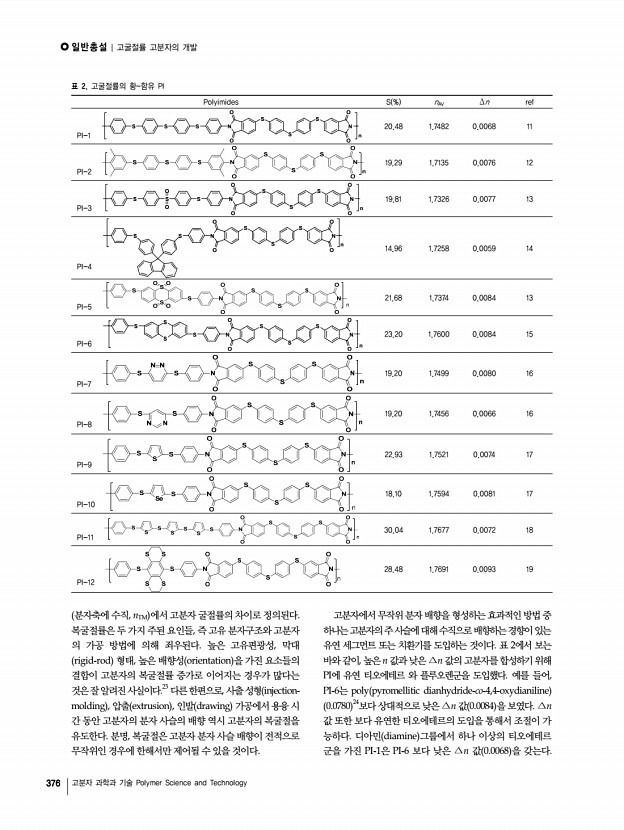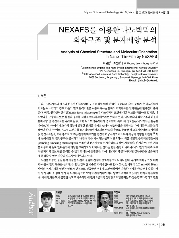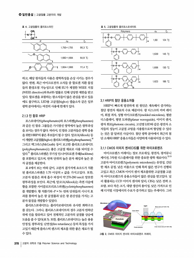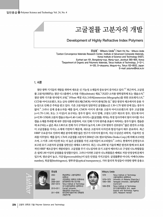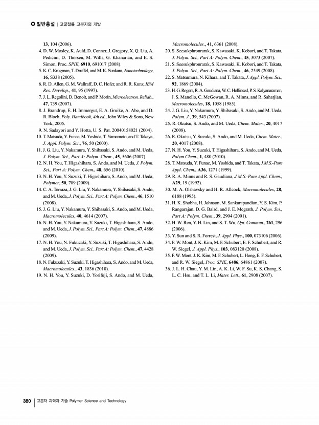일반총설 | 고굴절률 고분자의 개발 380 고분자 과학과 기술 Polymer Science and Technology 13, 104 2006 4. D. W. Mosley, K. Auld, D. Conner, J. Gregory, X. Q. Liu, A. Pedicini, D. Thorsen, M. Wills, G. Khanarian, and E. S. Simon, Proc. SPIE, 6910, 691017 2008 5. K. C. Krogman, T. Druffel, and M. K. Sunkara, Nanotechnology, 16, S338 2005 6. R. D. Allen, G. M. Wallraff, D. C. Hofer, and R. R. Kunz, IBM Res. Develop., 41, 95 1997 7. J. L. Regolini, D. Benoit, and P. Morin, Microelectron. Reliab., 47, 739 2007 8. J. Brandrup, E. H. Immergut, E. A. Gruike, A. Abe, and D. R. Bloch, Poly. Handbook, 4th ed., John Wiley & Sons, New York, 2005. 9. N. Sadayori and Y. Hotta, U. S. Pat. 20040158021 2004 10. T. Matsuda, Y. Funae, M. Yoshida, T. Yamamoto, and T. Takaya, J. Appl. Polym. Sci., 76, 50 2000 11. J. G. Liu, Y. Nakamura, Y. Shibasaki, S. Ando, and M. Ueda, J. Polym. Sci., Part APolym. Chem., 45, 5606 2007 12. N. H. You, T. Higashihara, S. Ando, and M. Ueda, J. Polym. Sci....
