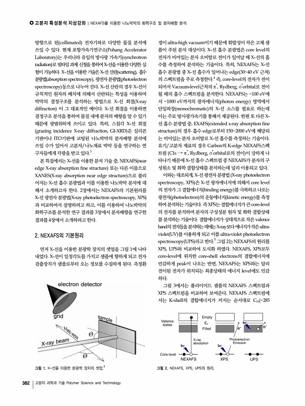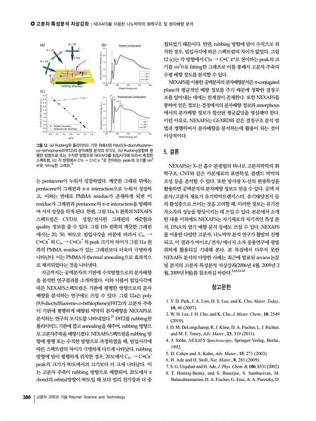 고분자 특성분석 지상강좌 | NEXAFS를 이용한 나노박막의 화학구조 및 분자배향 분석 384 고분자 과학과 기술 Polymer Science and Technology 그림 6. a Poly 9,9′-dioctylfluorene-co-bis-N,N ′- 4,butylphenyl -bisN,N′-phenyl-1,4-phenylene-diamine PFB 와 poly 9,9′-dioctylfluorenecobenzothiadiazole F8BT 의 화학구조, b PFB와 F8BT박막의 NEXAFS 스펙트럼, c PFBF8BT블렌드 박막의 조성에 따른 AFM 이미지.10 그림 5. SWNTs Single-walled carbon nanotubes 의 표면처리에 따른 NEXAFS스펙트럼.9 그림 8. Poly 3-hexylthiophene P3HT 의 빔입사각에 따른 NEXAFS스펙 트럼과 P3HT의 분자배향 모식도.3 그림 7. NEXAFS를 이용하여 공액분자의 분자배향을 분석하는 원리. 의 효율향상에 쓰일 수 있다. 4. NEXAFS를 이용한 나노박막의 분자배향 분석 NEXAFS는 XPS와는 다르게 나노박막의 화학구조 분석 뿐만이 아니라 분자배향 분석에도 쓰일 수 있다. 그...