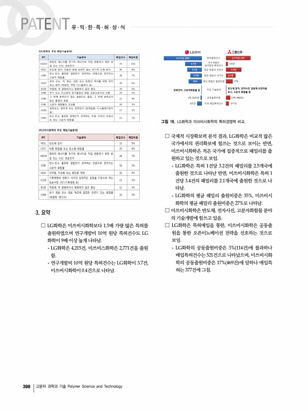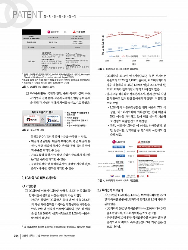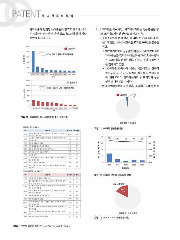 396 고분자 과학과 기술 Polymer Science and Technology 그림 11. LG화학 공동출원비중. 그림 12. LG화학 연도별 공동출원 현황. * 박스는 양사의 공통 주요기술분야 * 박스는 양사의 공통 주요기술분야 그림 10. LG화학과 미쓰비시화학의 주요 기술분야. 그림 13. 미쓰비시화학 공동출원비중. 광학기술과 관련된 특허출원에 힘쓰고 있으며, 미쓰 비시화학은 전자사진, 촉매 콜로이드 화학 등의 기술 개발에힘쓰고있음. □ LG화학은 특허매입, 미쓰비시화학은 공동출원을 통 한 오픈이노베이션 전략을 펼치고 있음. 공동출원현황 분석 결과, LG화학은 전체 측허의 3% 인 114건을, 미쓰비시화학은 17%인 469건을 공동출 원함. ∙ 미쓰비시화학의 공동출원 비중은 LG화학보다 6배 가까이 높은 것으로 나타났으며, 파이오니아전자, 롬, 쿄토대학, 본전신전화, 히타치 등과 공동연구 ...