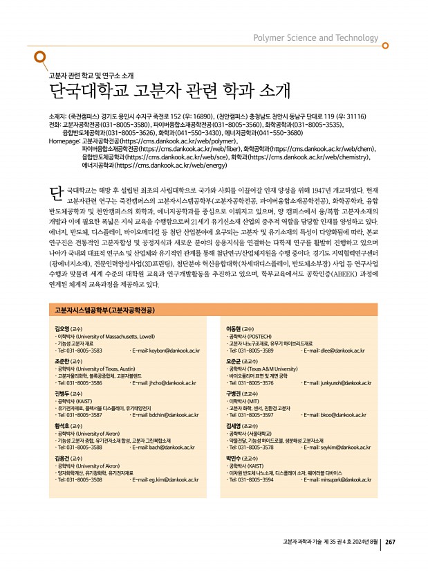 고분자 과학과 기술 제 35 권 4 호 2024년 8월 267 고분자 관련 학교 및 연구소 소개 단국대학교 고분자 관련 학과 소개 소재지죽전캠퍼스 경기도 용인시 수지구 죽전로 152 우16890 , 천안캠퍼스 충청남도 천안시 동남구 단대로 119 우31116 전화고분자공학전공 031-8005-3580 , 파이버융합소재공학전공 031-8005-3560 , 화학공학과 031-8005-3535 , 융합반도체공학과 031-8005-3626 , 화학과 041-550-3430 , 에너지공학과 041-550-3680 Homepage고분자공학전공 https//cms.dankook.ac.kr/web/polymer , 파이버융합소재공학전공 https//cms.dankook.ac.kr/web/fiber , 화학공학과 https//cms.dankook.ac.kr/web/chem , 융합반도체공학과 https//cms.dankook.ac.kr/web/sce , 화학과 https//cms.dankook.ac.kr/web/chemistry , 에너지공학과 https//cms.dankook.ac.kr/web/energy 국대학교는 해방 후 설립된 최초의 사립대학으로 국가와 사회를 이끌어갈 인재 양성...