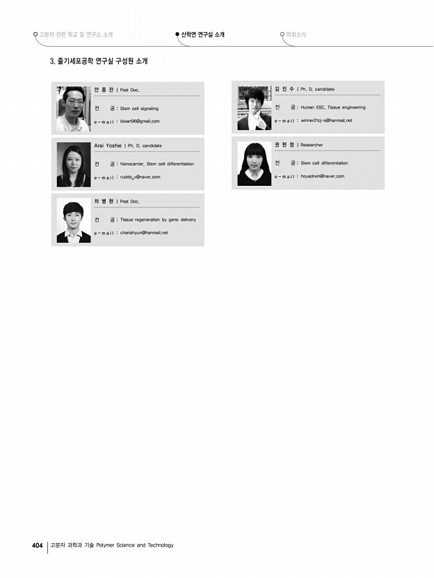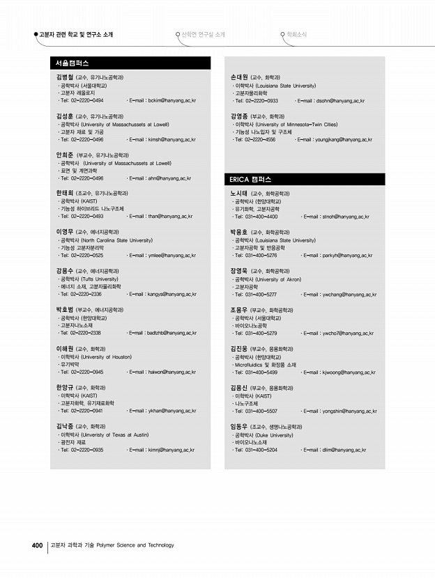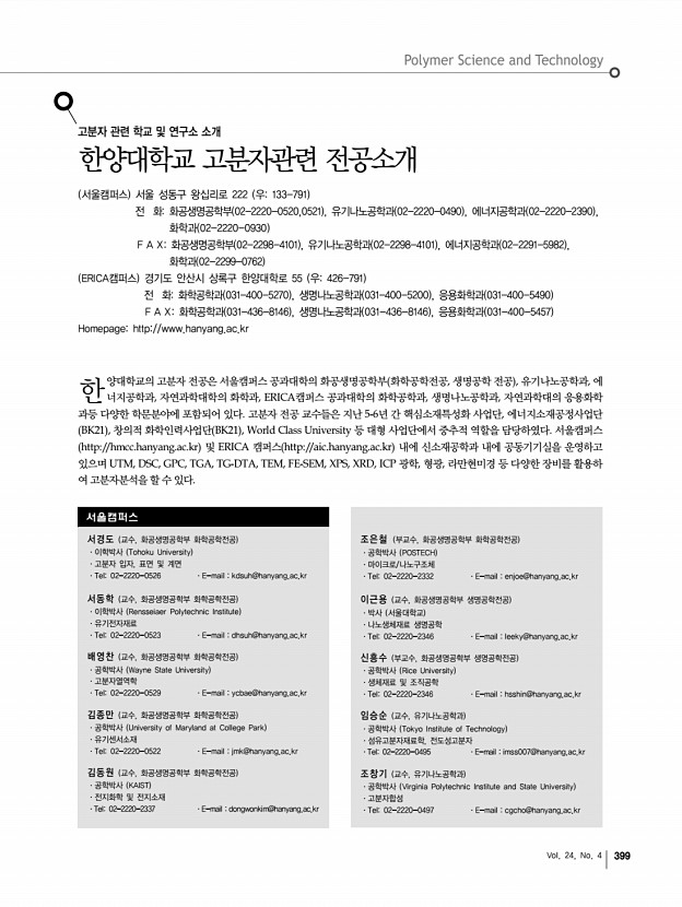 ...0762 ERICA캠퍼스 경기도 안산시 상록구 한양대학로 55 우426-791 전 화화학공학과 031-400-5270 , 생명나노공학과 031-400-5200 , 응용화학과 031-400-5490 F A X화학공학과 031-436-8146 , 생명나노공학과 031-436-8146 , 응용화학과 031-400-5457 Homepagehttp//www.hanyang.ac.kr 양대학교의 고분자 전공은 서울캠퍼스 공과대학의 화공생명공학부 화학공학전공, 생명공학 전공 , 유기나노공학과, 에 너지공학과, 자연과학대학의 화학과, ERICA캠퍼스 공과대학의 화학공학과, 생명나노공학과, 자연과학대의 응용화학 과등 다양한 학문분야에 포함되어 있다. 고분자 전공 교수들은 지난 5-6년 간 핵심소재특성화 사업단, 에너지소재공정사업단 BK21 , 창의적 화학인력사업단 BK21 , World Class University 등 대형 사업단에서 중추적 역할을 담당하였다. 서울캠퍼스 http//hmcc.hanyang.ac.kr 및 ERICA 캠퍼스 http//aic.h...
