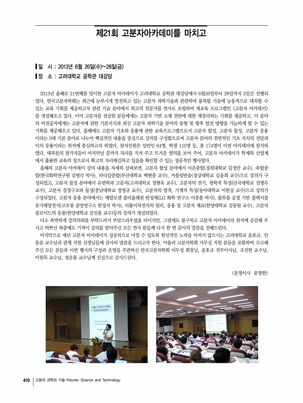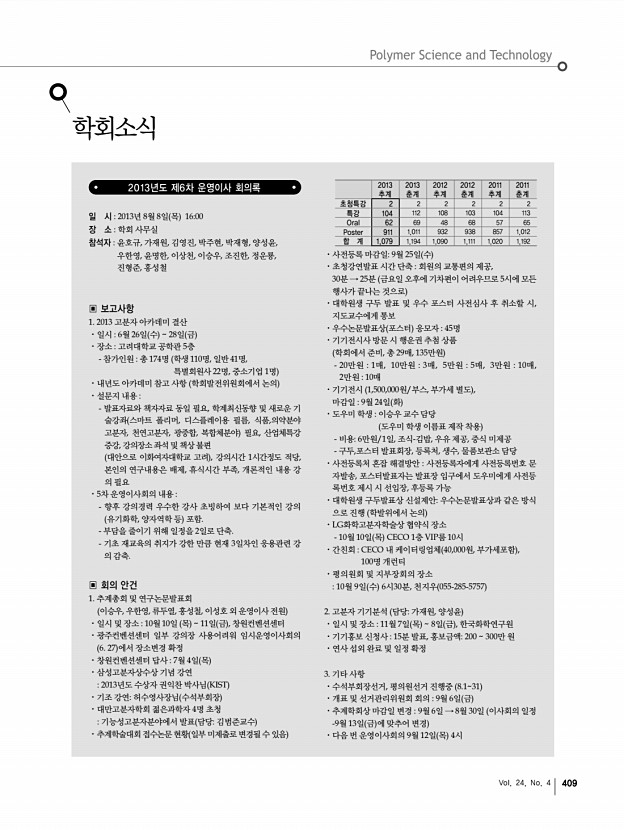 ...구논문발표회 이승우, 우한영, 류두열, 홍성철, 이성호 외 운영이사 전원 ⋅일시 및 장소 10월 10일 목 11일 금 , 창원컨벤션센터 ⋅광주컨벤션센터 일부 강의장 사용어려워 임시운영이사회의 6. 27 에서 장소변경 확정 ⋅창원컨벤션센터 답사 7월 4일 목 ⋅삼성고분자상수상 기념 강연 2013년도 수상자 권익찬 박사님 KIST ⋅기조 강연허수영사장님 수석부회장 ⋅대만고분자학회 젊은과학자 4명 초청 기능성고분자분야에서 발표 담당김범준교수 ⋅추계학술대회 접수논문 현황 일부 미제출로 변경될 수 있음 2013 추계 2013 춘계 2012 추계 2012 춘계 2011 추계 2011 춘계 초청특강 2 2 2 2 2 2 특강 104 112 108 103 104 113 Oral 62 69 48 68 57 65 Poster 911 1,011 932 938 857 1,012 합 계 1,079 1,194 1,090 1,111 1,020 1,192 ⋅사전등록 마감일9월 25일 수 ⋅초청강연발표 시간 단축 회원의 교통편의 제공,...