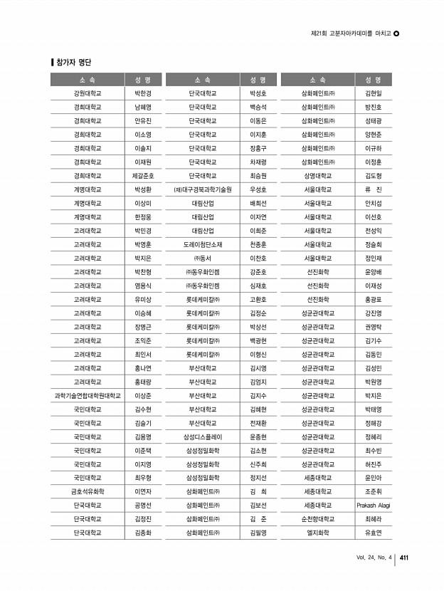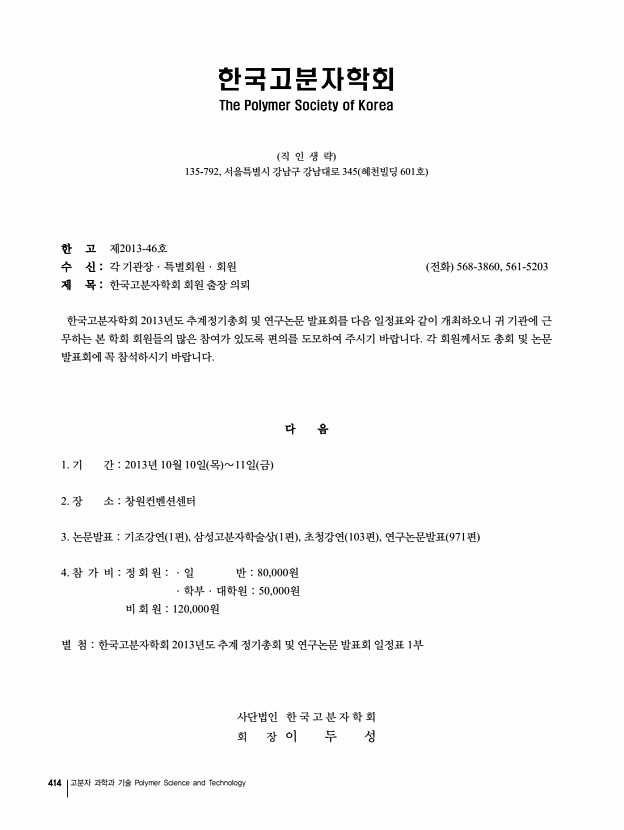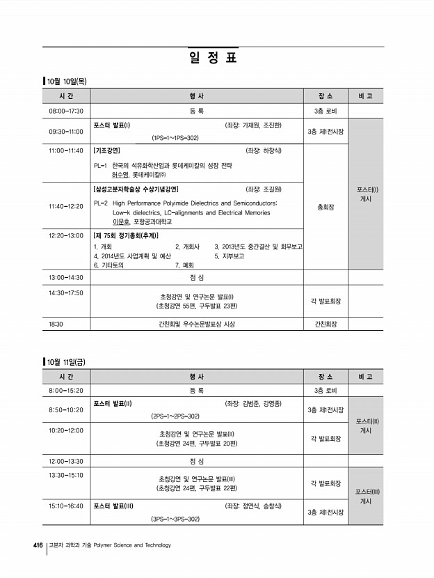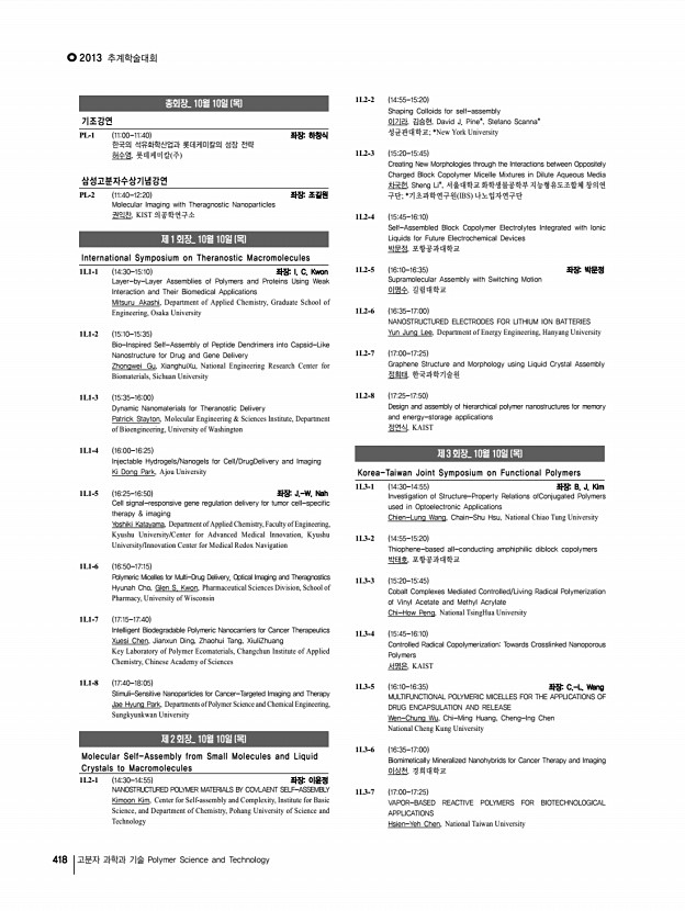 2013 추계학술대회 418 고분자 과학과 기술 Polymer Science and Technology 총회장_ 10월 10일 목 기조강연 PL-1 1100-1140 좌장하창식 한국의 석유화학산업과 롯데케미칼의 성장 전략 허수영, 롯데케미칼 주 삼성고분자수상기념강연 PL-2 1140-1220 좌장조길원 Molecular Imaging with Theragnostic Nanoparticles 권익찬, KIST 의공학연구소 제1 회장_ 10월 10일 목 International Symposium on Theranostic Macromolecules 1L1-1 1430-1510 좌장I. C. Kwon Layer-by-Layer Assemblies of Polymers and Proteins Using Weak Interaction and Their Biomedical Applications Mitsuru Akashi, Department of Applied Chemistry, Graduate School of Engineering, Osaka University 1L1-2 1510-1535 Bio-Inspired Self-Assembly of Peptide Dendrimers into Capsid-Like Nanostructure for Drug and Gene Delivery Zhongwei Gu, XianghuiXu, National Engineering Research Center for Biomaterials, Sichuan University 1L1-3 1535-1600 Dynamic Nanomaterials for Theranostic...