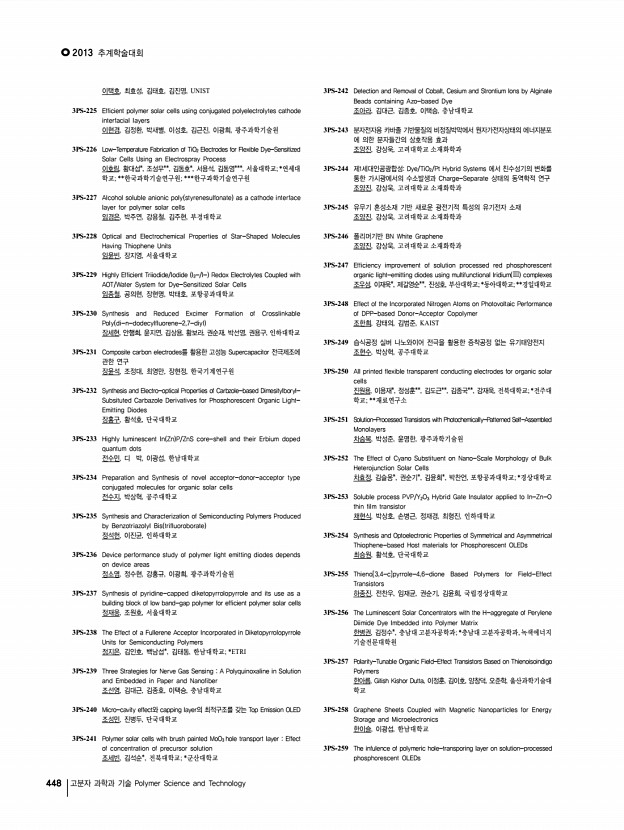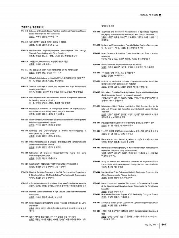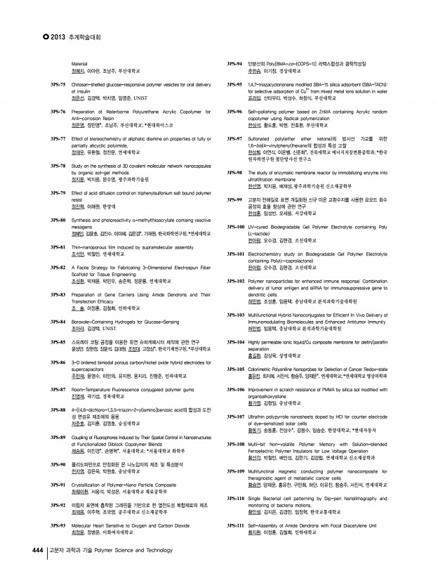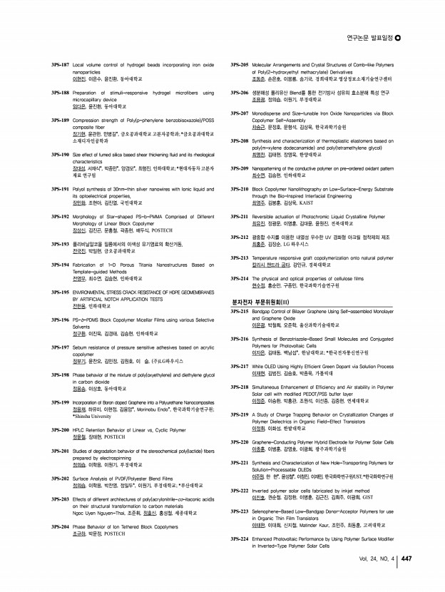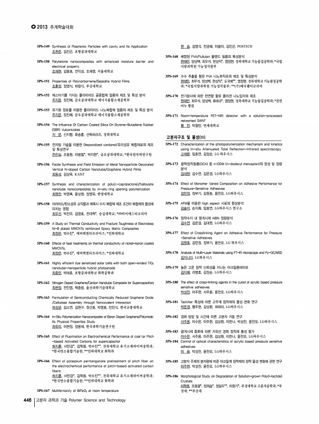 ...정구환, 이진욱, 김경태, 김승현, 인하대학교 3PS-197 Sebum resistance of pressure sensitive adhesives based on acrylic copolymer 정부기, 윤찬오, 김민정, 김원호, 이 슬, 주 LG하우시스 3PS-198 Phase behavior of the mixture of poly oxyethylene and diethylene glycol in carbon dioxide 정용송, 이상호, 동아대학교 3PS-199 Incorporation of Boron doped Graphene into a Polyurethane Nanocomposites 정용채, 하유미, 이현정, 김융암*, Morinobu Endo*, 한국과학기술연구원; *Shinshu University 3PS-200 HPLC Retention Behavior of Linear vs. Cyclic Polymer 정윤철, 장태현, POSTECH 3PS-201 Studies of degradation behavior of the stereochemical poly lactide fibers prepared by electrospinning 정의습, 이학용, 이원기, 부경대학교 3PS-202 Surface Analysis of PVDF/Polyester Blend Films 정의습, 이학용, 박찬영, 정일두*, 이원기, 부경대학교; *부산대학교 3PS-203 Effects of different architectures of poly acrylonitril...