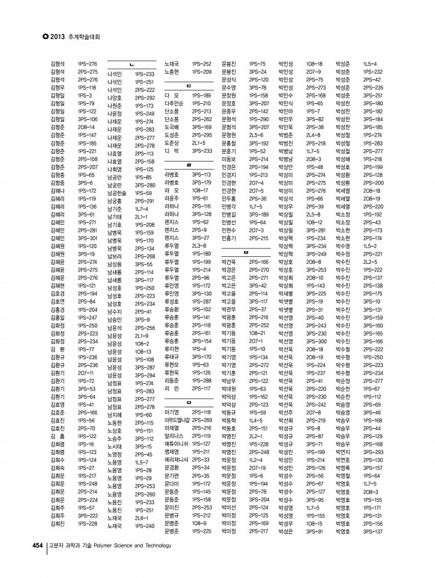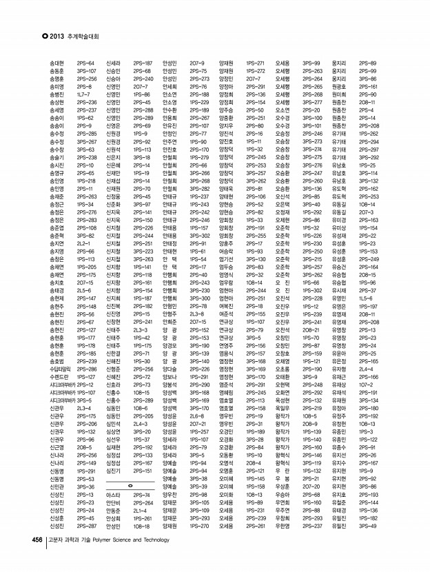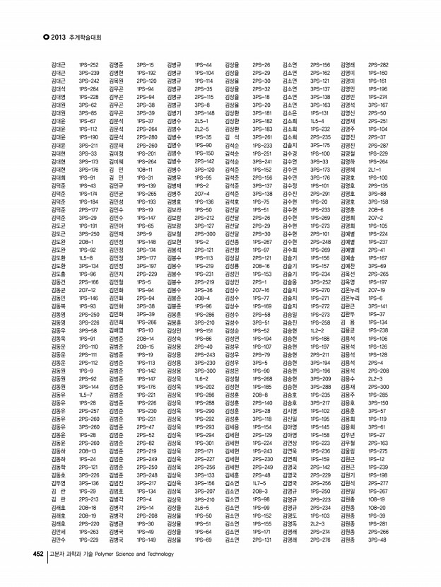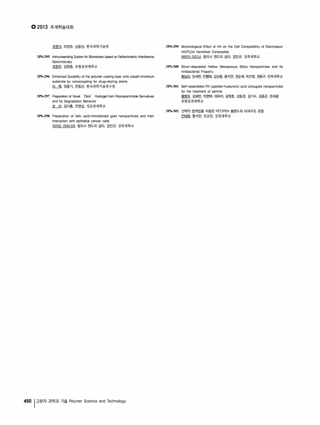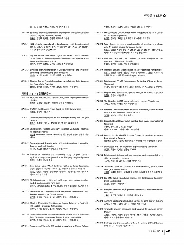 연구논문 발표일정 Vol. 24, NO. 4 449 한 현, 윤성철, 이창진, 이재민, 한국화학연구원 3PS-260 Synthesis and characterization of polythiophene with semi-fluoroalkyl chain for organic electronic devices 허윤정, 정형구, 김지홍, 김동유, 광주과학기술원 3PS-261 Highly efficient polymer solar cell modules fabricated by slot-die coating method 홍순일, 강홍규*, 이종진**, 이민진**, 김재령**, 이선규*, 김 석*, 이광희*, GIST; *광주과학기술원; **RISE 3PS-262 High-Performance n-Channel Organic Field-Effect Transistors Based on Naphthalene Diimide Incorporated Thiophene-Free Copolymers with Acene and Heteroacene Units 홍자연, 김이호, 양창덕, 오준학, 울산과학기술대학교 3PS-263 Synthesis and Characterization of Diketopyrrolopyrrole and Thiophene containing Semiconducting Small Molecules 홍태량, 신지철, 이태완, 조민주, 최동훈, 고려대학교 3PS-264 Effect of Counter Anion in Polyviologen as A Cat...