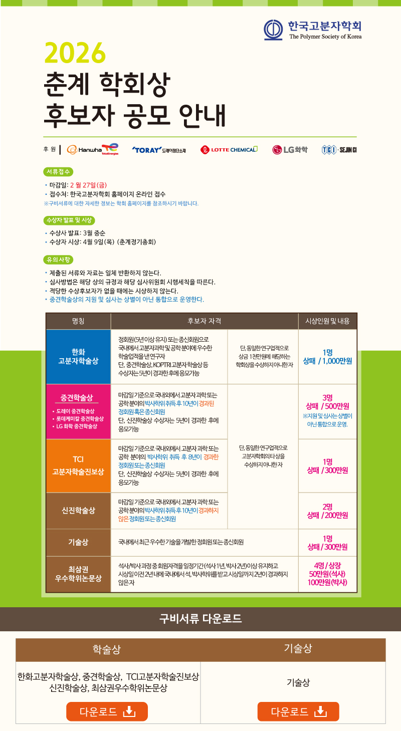 한국고분자학회는 2024년부터 TCI세진씨아이 후원으로 신진및중견 연구자를 대상으로 하는 「TCI고분자학술진보상」을 시상합니다. 본 상은 춘추계 각 1명씩 시상하며 상금은 3백만 원입니다. 회원 여러분의 많은 응모와 추천을 바랍니다.