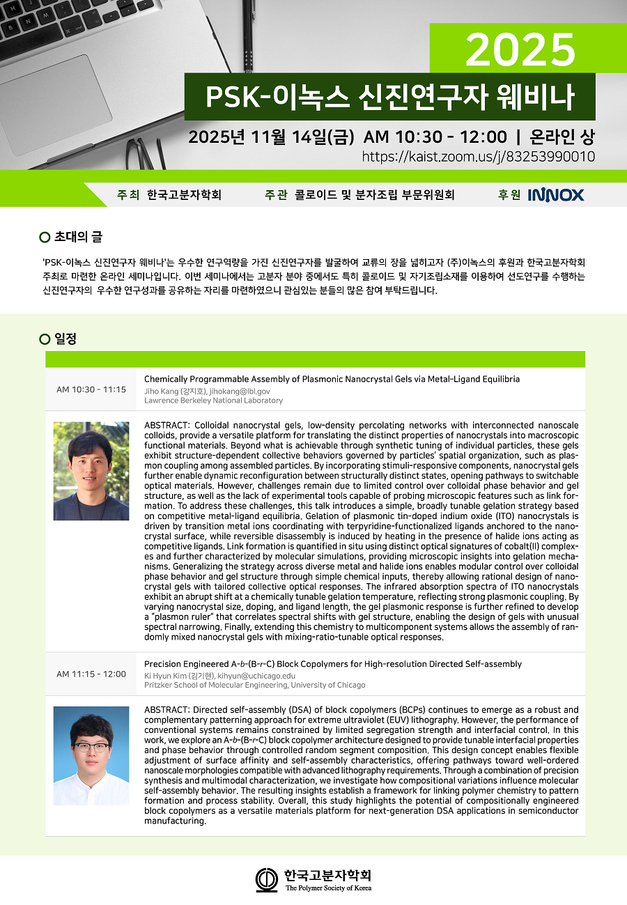 PSK-이녹스 신진연구자 웨비나 안내 (콜로이드 및 분자조립 부문위원회) (행사일: 2025.11.14)