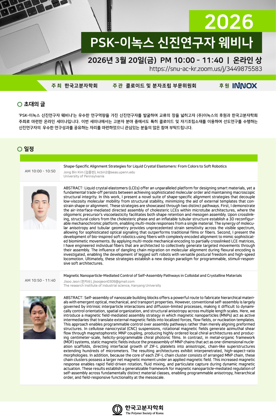 PSK-이녹스 신진연구자 웨비나 안내 (콜로이드 및 분자조립 부문위원회) (행사일: 2026.3.20)