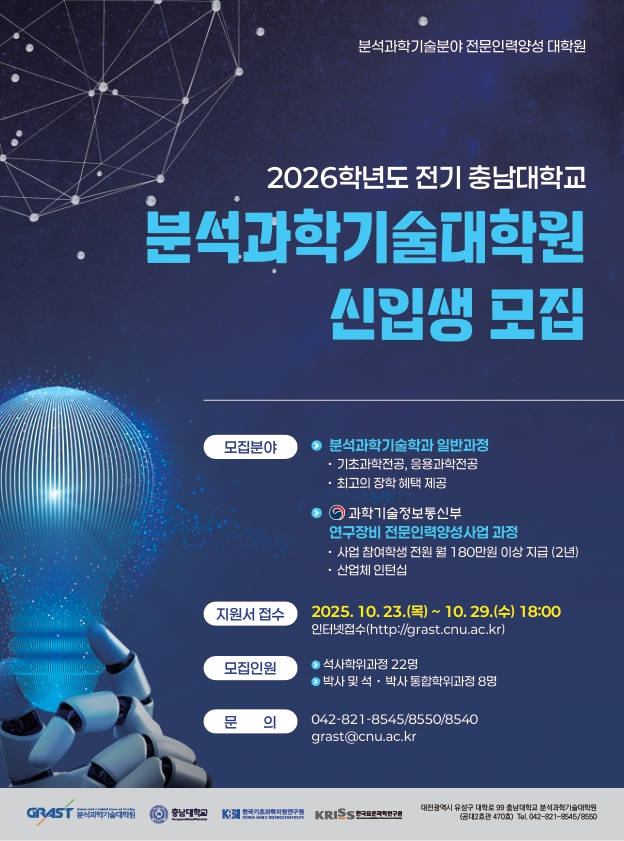 [구인] 충남대학교 분석과학기술대학원 2026학년도 전기 신입생 모집 안내 (마감일: 10월 29일)