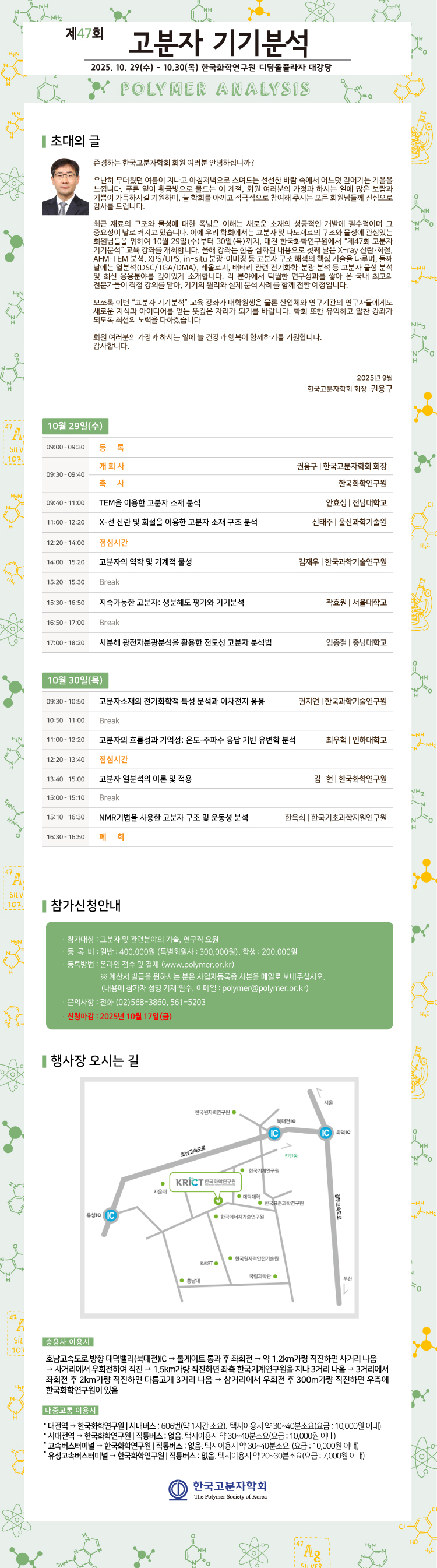 ※ 계산서 발급을 원하시는 분은 사업자등록증 사본을 메일로 보내주십시오. (내용에 참가자 성명 기재 필수, 이메일: polymer@polymer.or.kr)