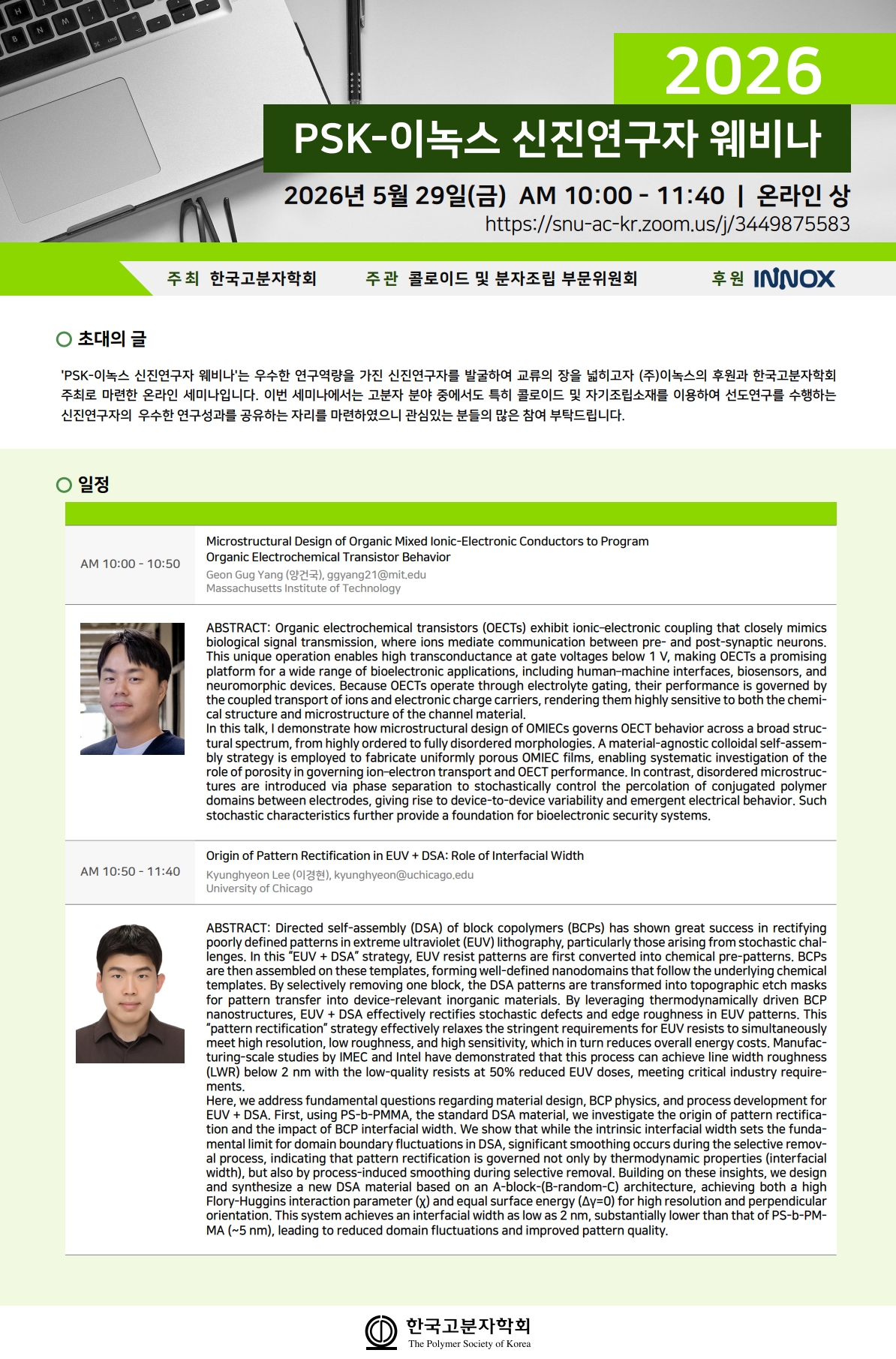 PSK-이녹스 신진연구자 웨비나 안내 (콜로이드 및 분자조립 부문위원회) (행사일: 2026.5.29)